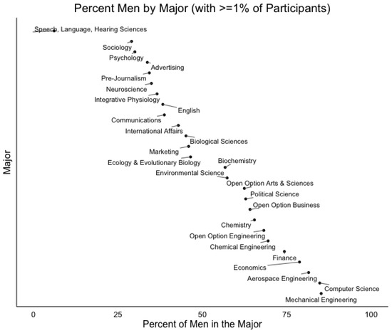 Gender representation in common academic majors within the sample (i.e., that is, majors declared by at least one percent of participants in the sample (n = 26).