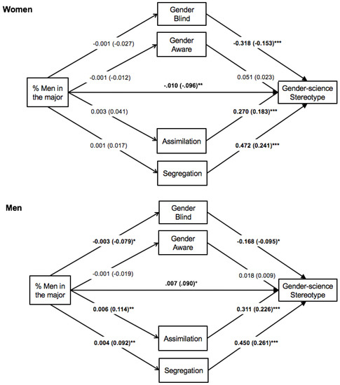 A path analysis of the relationship between percent men in the major and gender-science stereotypes for women and men. Although not depicted for simplicity, covariates included semester collected and academic year; moreover, ideologies were allowed to correlate with one another. Unstandardized regression coefficients are provided outside of parentheses; standardized regression coefficients are provided in parentheses. Asterisks indicate significance of relationships (* p < 0.05, ** p < 0.01, *** p < 0.001). The relationship between percent men in the major and gender-science stereotype endorsement was significantly different for women and men; all other paths were not significantly different.