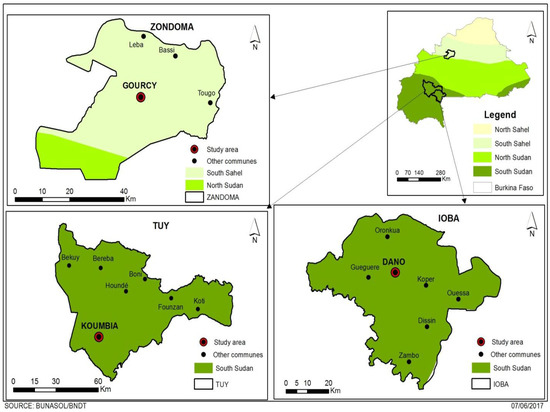 The data used in this study was drawn from a cross-sectional study at household and village levels in three (3) rural communes in Burkina Faso (Figure 1). These include the rural communes of Gourcy (13°13′ N–2°21′ W) in Zondoma province, Dano (11°55′ N–3°22′ W) in Ioba province and Koumbia (11.226898° N–3.713379° W) in Tuy province1. Zondoma province is located in the Nord region of Burkina Faso. The area is characterized by erratic, insufficient, and improperly distributed precipitation. The annual rainfall is between 500 mm and 750 mm with a mean annual temperature of 28.3 °C. Ioba and Tuy provinces are situated in the Sud-Ouest and Hauts-Bassins regions, respectively. These areas are endowed with relatively good rainfall and are among the better-watered areas of Burkina Faso. The annual rainfall is between 900 mm and 1200 mm and average annual temperature is 27.7 °C; this adds to the good quality of soils, conferring on these provinces propitious areas for agro-pastoral activities. The three sites were selected in order to capture the effect of farmers’ geographical position (weather conditions’ impact) on their response to climate hazards.