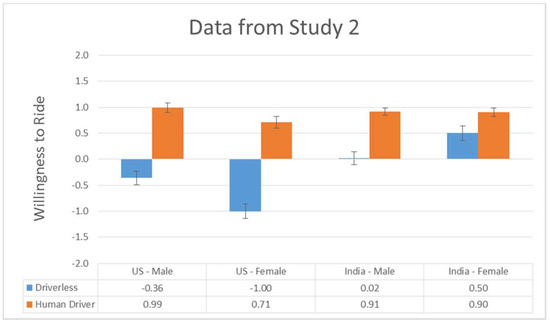 Study 2 was identical to Study 1 with the following two exceptions. First, we collected data from both genders and across two nationalities (USA and India). Thus, there were three independent variables. The first variable (type of driver) was manipulated to be either a traditional licensed human driver or a driverless autopilot. The second variable was Gender, while the third variable was Nationality of the participant (USA or India).