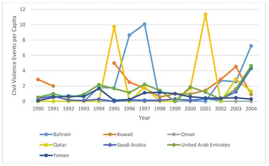 Civil Violence Events per Capita: Arab Gulf, 1990–2004.