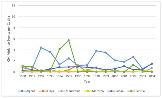 Civil Violence Events per Capita: North Africa, 1990–2004.