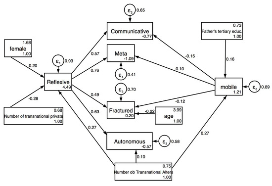 1Yet, this does not mean that the significance of short-term student mobility (i.e., even for just one month) implies that transnational personal ties are irrelevant. Our path analysis confirms mobile students have a bigger number of transnational alters. The standardised coefficient between the number of transnational alters and mobility is 0.268. While mobility does not affect the general level of reflexivity as such, the latter is positively affected by the numbers of transnational alters (0.269), while negatively affected by the number of transnational private alters (−0.278) and by being a male (i.e., female students are more likely to indicate higher levels of reflexivity).