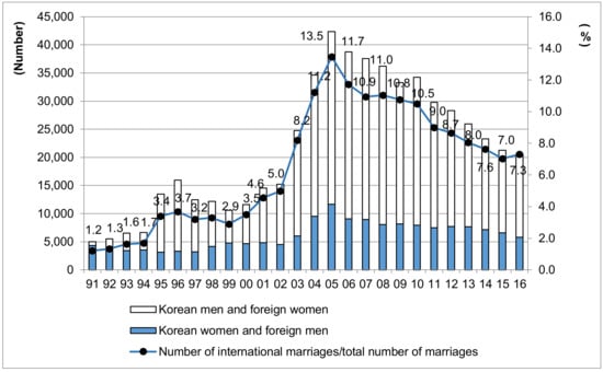 Trends in the number of multicultural families residing in Korea (1991–2016).