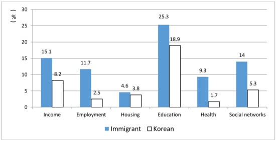 We begin with a simple comparison of multicultural and Korean families for each dimension of social exclusion. Figure 2 compares the proportions of those who are experiencing exclusion in each dimension for both family groups.7