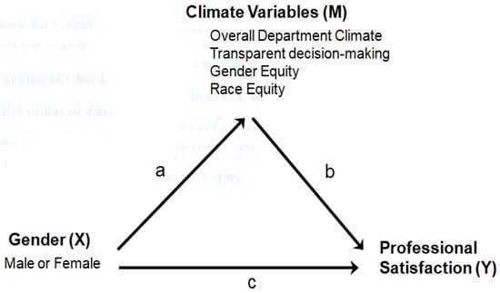 Conceptual mediational model examining whether gender differences in faculty members’ professional satisfaction is mediated by differential perceptions of department climate.