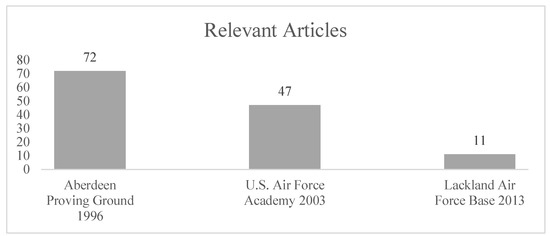 Using the established search terms, data collection initially resulted in a total of 270 articles in The New York Times and USA Today. This included 115 articles about the Aberdeen Proving Ground sexual assault scandal, 131 articles about the U.S. Air Force Academy sexual assault scandal, and 24 articles about the Lackland Air Force Base sexual assault scandal. After reviewing these articles, it was determined that only some were relevant to the cases. The articles that were irrelevant had little to no information on the allegations or only mentioned the name of the scandal in regards to other, unrelated news stories. To ensure reliability, a second researcher independently reviewed every article from each of the three military incidents and recorded relevant versus non-relevant articles. The primary researcher then compared articles and determined the final list of relevant articles utilized in the study. The final sample (n = 130) resulted in 72 Aberdeen Proving Ground articles, 47 articles on the U.S. Air Force Academy sexual assault scandal, and 11 relevant articles about the Lackland Air Force Base scandal.
