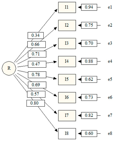 In order to examine the theoretical model fit to the empirical data, we performed a confirmatory factor analysis. The model being tested is made up of a single factor (high-risk internet behaviours). Each item in the questionnaire would be explained by this factor. The results indicate that this single-factor model adequately represents the data we obtained χSB2 = 111.96; df = 20; χ2/df = 5.60; NFI = 0.960; CFI = 0.967; RMSEA = 0.070 (90% CI: 0.057–0.082). The factorial weightings for each item in the factor are moderate or high (Figure 1).
