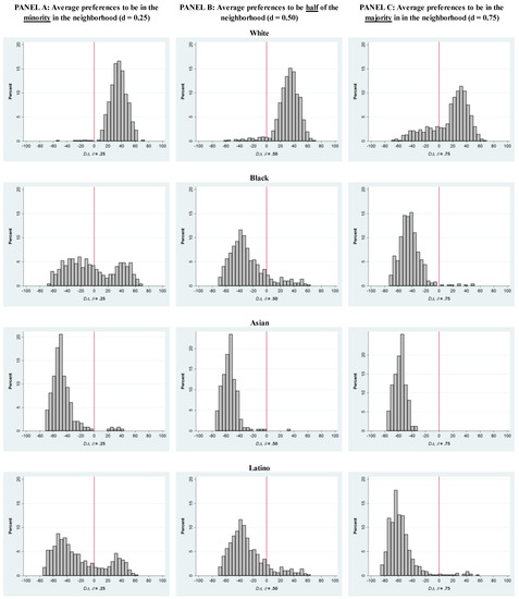Distributions of DΔ, by in-group race/ethnicity and value of δ (percent own group preferred).