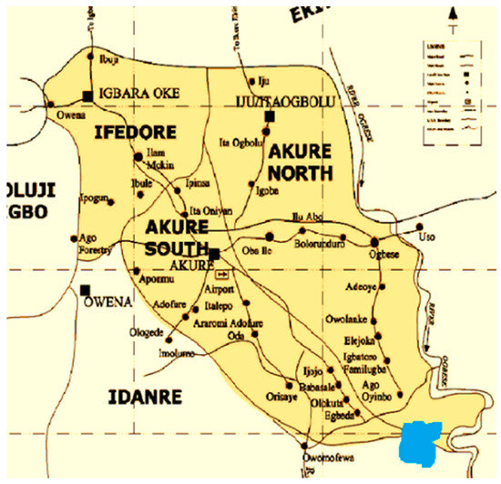 The political boundaries of Akure North and the location of Ala Ajagbusi (blue spot). Adapted from the work of Olamiju and Olujimi (Oluwadare and Julius 2011).