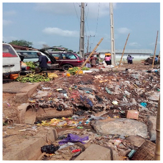 Unlike in the city, markets in Ala Ajagbusi are not held on daily basis, but periodically. The market days are often at five-day intervals. On the market day, the market waste situation was observed; there was waste littering the ground, there were children pushing the remnants of plantain with wheelbarrows, and villagers were engaged in buying and selling. Many marketers come from different villages to engage in marketing activities. Marketers generate various types of waste such as plastic waste, paper waste, and agricultural waste. The common practice among marketers is to leave the waste in the market until the subsequent market day. When the marketers sweep their stalls before they start sales; “On the market day the environment is littered with paper, plastic bags, and other sorts of waste. These are left until another market day before being swept, unless surface runoff has already moved it down the stream. On every market day, before each marketer starts sales, each has to clean up her stall and its surroundings” (Interview with informant M11, March 2017).