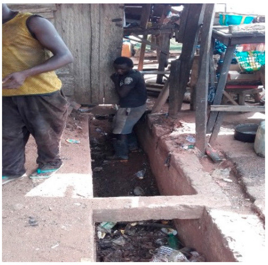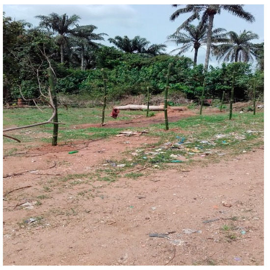 The practices of littering the “commons” (spaces shared by those living in a specific house) with trash during the day and getting it swept before dawn through a socially organized arrangement is necessitated by a lack of waste bins in the commons. This is also similar in public spaces, i.e., streets, markets, viewing centres, and religious centres. In the village, there are no waste bins on the streets, in the markets or other public spaces; thus, villagers throw trash indiscriminately. When the generated waste is being swept up, the waste is often stored unseparated in a sack, bag or bowl before being burnt or emptied into the bush, under the power line or into the street side drainage channel. Each family has its own waste sack and different methods for disposing of waste; “We pack the household waste in a sack unsorted and take it to the carpark there [using her finger to point towards the direction of ther carpark]; besides this carpark there is a wide waterway where we empty the waste, especially during the rainy season, with the expectation that the running water will take it down the stream” (Interview with Informant W2, March 2017). See Figure 4.