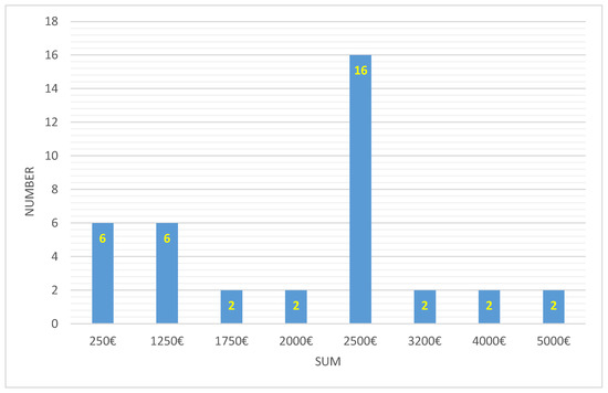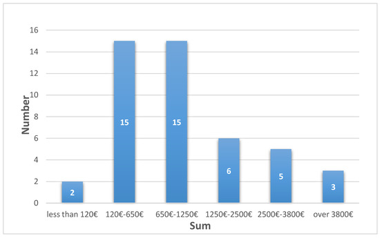 The distribution of self-funding of treatment in interviewed poor children with congenital heart disease (PCHD) families, (n = 46), in Euros.
