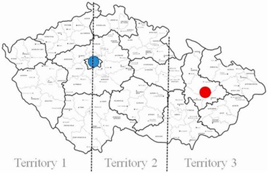 Figure 2 shows the division of the Czech Republic into three sales territories. Two business representatives are based in Prague (blue location) and one in the Home Office work model in Olomouc (red location). In addition to the even distribution of customers and the level of sales, this division also resulted in an even travel burden.