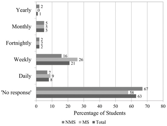 We also asked students how often they watched nature and/or environmental-based television shows based on given options: daily, weekly, fortnightly, monthly, and yearly. Daily and weekly viewings were more popular among both NMS and MS sub-groups. Among the total sample 21 percent of students followed such shows on a weekly basis (Figure 2). The NMS and MS students equally watched monthly (5%) and fortnightly (2%) television shows (Figure 2). However, the percentage of MS students was higher than NMS students for watching daily and weekly shows (Figure 2). The percentages of NMS and MS students who provided no response to the relevant question were high, i.e., 67 and 58 respectively (Figure 2). This indicated low motivation and interest levels among both NMS and MS students for watching television programs related to nature and/or environment.