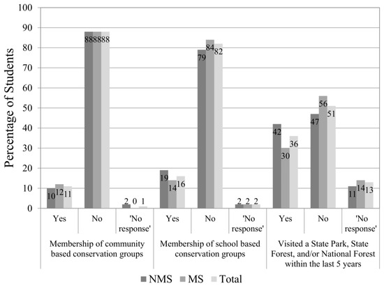 Twelve percent of MS students had membership in community-based conservation groups, which was slightly higher than the percentage of NMS students (10%) (Figure 3). However, the percentages of NMS students who had membership of school-based conservation groups and had visited a park and/or forest were 19 and 42, respectively, which were higher than the percentages of MS students and the percentages of total students (Figure 3). Although there was low experience and participation level of NMS and MS students in pro-environmental activities, we found a relatively higher experience of students from each group for visiting parks/forests, than participating in community or school-based conservation groups within the last five years.