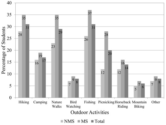 Some of the NMS and MS students had experience of participating in different outdoor activities during the last 5 years. The MS students were more active in the outdoors than NMS students. The participation percentages of MS students in hiking, camping, nature walks, bird watching, fishing, picnicking, horseback riding, mountain biking, and other activities were 35, 19, 35, nine, 37, 28, 16, seven, and nine, respectively, whereas the participation percentages of NMS students in these activities were 28, 16, 23, seven, 26, 12, 12, five, and seven, respectively (Figure 4). Among the outdoor activities, fishing, hiking, nature walks and picnicking were the most popular among the MS students whereas NMS students favored hiking, fishing, camping, and picnicking (Figure 4). In general, the experience of participating in outdoor activities among MS students was higher than among NMS students.