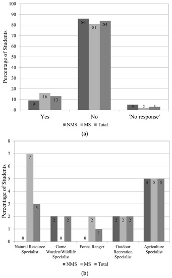 The percentages of NMS, MS, and total students (a) who had/did not have interest in attending college and preparing for careers in the fields of agriculture and/or environmental sciences, and (b) who had career preferences in the fields of agriculture and/or environmental sciences. Here, the percentage of ‘yes’ responses was divided into preferred career fields. ‘No response’ means students did not respond to the relevant question. Data values are reflected inside the bar.