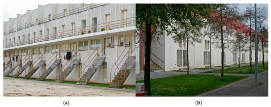 The SAAL initiative, mentioned above, set from the inhabitants’ right to the city, contradicting the previous policy of relocating populations in peripheral estates. These participated designs were based on central or populated areas, where those in need of housing already lived. In Porto we find some iconic instances of the pioneer SAAL movement, such as the Sao Victor Estate (1974–1977) (MdH DB a826) (Figure 7a,b) and the Bouça Estate (Phase 1 1973–1979; Phase 2 1999–2006) (MdH DB a827) (Figure 8a,b), both by Architect Alvaro Siza.