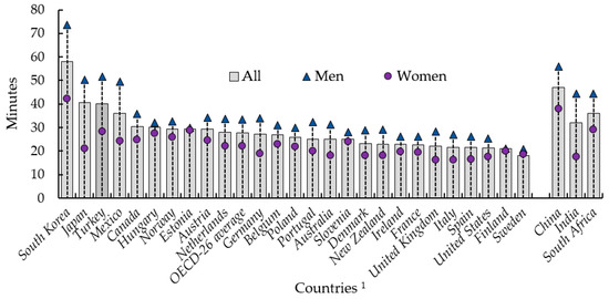 It is logically expected that employees in the industrialized countries that have many populous cities and metropolises with business clusters will have higher CS. However, global surveys tend to confute this prediction that CS is not directly related to the development stages and densely populated urban areas of countries (PageGroup 2018). A cross-country presentation of the Organisation for Economic Co-operation and Development (OECD) (OECD Family Database 2018) provided in Figure 1 demonstrates that the average amount of time that individuals spend traveling to and from work differs considerably across OECD countries as well as China, India, and South Africa. In South Korea, for example, employees on average spend around one hour commuting. South Korea is followed by other Asian countries such as China and Japan. These countries also have the highest gender differences, in which male employees spend much more time than women do while commuting. Turkey, where employees spend 40 min commuting on average per typical working day, is among the countries with the longest commuting time. Furthermore, the daily commuting time of male employees (52 min) is much more than that of female employees (28 min) in Turkey. In spite of the indications (e.g., Costal et al. 1988) that commuting durations can be independent of distances as a result of faster commuting modes, both tend to be a stress factor for working commuters. In addition to lengthy commuting destinations, global surveys also reveal that employees in Turkey subsequently experience a high CS as well (PageGroup 2018).