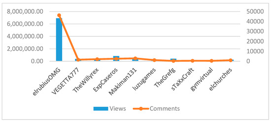 Although the elrubiusOMG video holds first place in all four interaction variables, the relationship between views and social actions is not repeated for the rest of the channels, as can be seen in the ranking in Figure 1. The highest ratio between comments and views in this sample belongs to the TheWillyrex video, with 1%, while the video by TheGrefg has a ratio below 0.1% for this value. The video with fewest views in this sample is by gymvirtual, with 120,144 views, and three videos have fewer than 1000 comments: The videos by TheGrefg, sTaXxCraft, and gymvirtual. The videos that receive the highest number of comments in relation to the “likes” obtained are the ones by TheWillyrex and ExpCaseros, both with 10.7%.