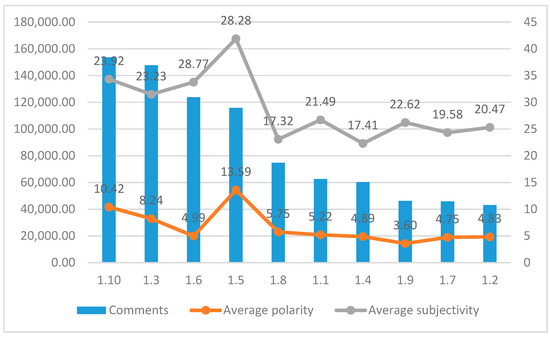 Neither polarity nor subjectivity follow a regular pattern in their relationship with the comments received about the videos. As it was the most outstanding case, the relationship between comments, polarity, and subjectivity for the channel elrubiusOMG is detailed in Figure 2: