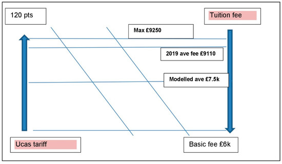 Figure 1 conceptualises the dual demand for each type of price: The highest demanded UCAS Tariff of 120 points is matched by the maximum tuition fee, while those institutions that can only demand lower points are only able to justify and charge the basic fee (currently £6000 per year). This would, theoretically, assert downward pressure on the average tuition fee so that it more closely aligns with government modelling at the time of the introduction of the new fee/repayment regime in 2011 (which assumed affordability for government at an average fee of £7500 per year).