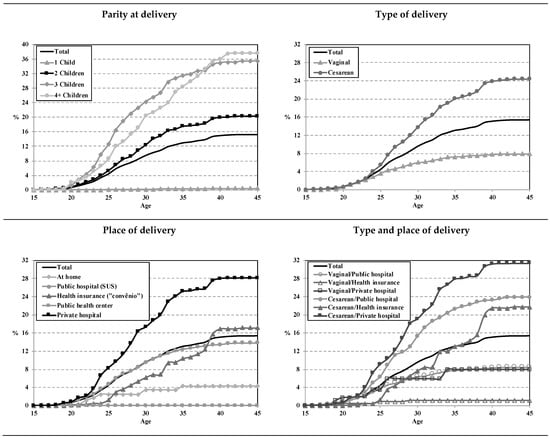 On one hand, women with high levels of sterilization, high percentages of more than one pregnancy between January 2001 and July 2007, and larger parity than the desired number of children tend to have the following characteristics: high parity (three, four or more children); black, brown (who have not yet reached the desired number of children), or indigenous; residents in the North or Northeast regions; low levels of education (up to three years of schooling); and two or more unions. On the other hand, women with high levels of sterilization, low percentages of more than one pregnancy in the period, and lower parity than the desired number of children tend to have the following characteristics: cesarean section deliveries; birth using health insurance (“convênio”) or direct out-of-pocket payments at private hospitals; and are married. More specifically, the cumulative percentage distributions of sterilized women by age at sterilization indicate that sterilization is more associated with type of delivery than with place of delivery.