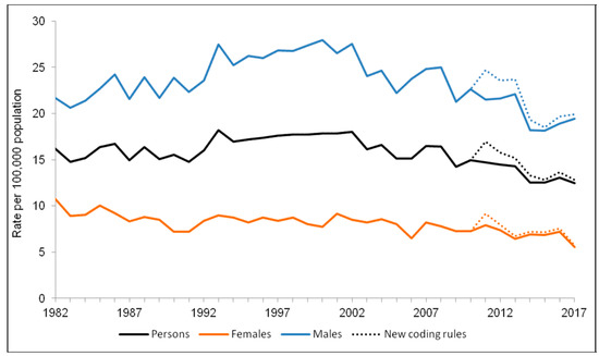 - Stark, Cameron, Diane Stockton, and Rob Henderson. 2008. Reduction in young male suicide in Scotland. BMC Public Health 8: 80. [Google Scholar] [CrossRef] [PubMed]