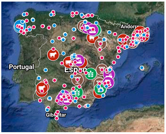 Figure 2 shows the industrial food districts (represented by the sign), the university training centers (blue dots/spots) that offer training related to the food industry and the vocational training centers (red dots) that similarly offer this type deformation. Likewise, each industrial food district is in turn identified with its specialization: Beverages (7 districts); meat products (13 districts); fruits and vegetables (6 districts); fish (2 districts); other food products (5 districts); several (4 districts). At the aggregate territorial level, most of the districts are concentrated in three axes. The central axis crosses the peninsula from Galicia to the Valencian Community. The second axis begins in La Rioja and Navarra and extends to Catalonia. Finally, the third axis begins in western Andalusia and, crossing this autonomous community, extends to Murcia.
