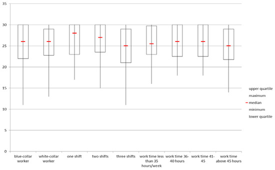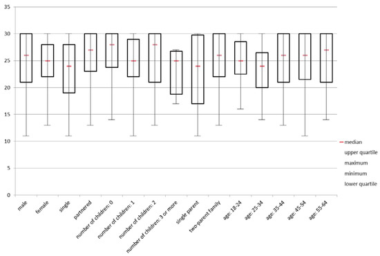 As a first indicator of work-family balance, the boxplot in Figure 1, Figure 2 and Figure 3 sums up the basic distributions of the balance scores across the most important work-related, social and demographic characteristics. The median, the minimum and maximum values, the upper and lower quartile are displayed.