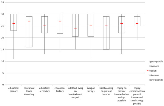 In the figures above, the lower work-family balance scores and larger dispersions of the scores are obvious in the case of some groups like singles, single parents, parents with many children, low educated people, especially with lower secondary education and people with a precarious financial situation hardly coping on their income. Also, for employees working in three shifts as well as those above the weekly work hours of 45, the lowest scores are displayed which never reach the maximum possible score on the work-family balance scale.