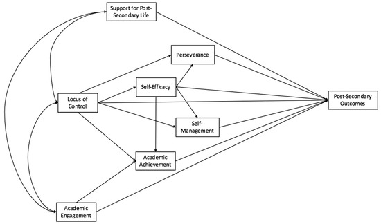 Support for post-secondary life significantly mediated the relationship between self-efficacy and college enrollment (OR = 1.08 (1.05, 1.11); p < 0.001); and between locus of control and college enrollment (OR = 1.36 (1.31, 1.42); p < 0.001). Locus of control significantly mediated the relationship between self-efficacy and college enrollment (OR = 2.11 (2.04, 2.17); p < 0.001).