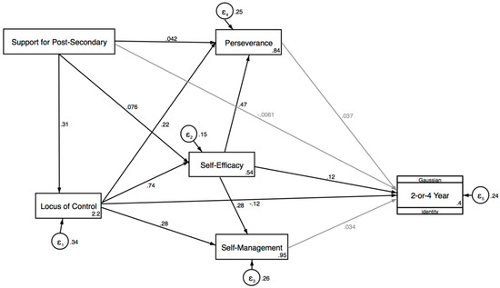 The GSEM analysis indicated that locus of control was associated with a significantly decreased likelihood to enroll in college (OR = 0.89 (0.80, 0.99); p < 0.05), and general self-efficacy was significantly predictive of an increased likelihood to enroll in college (OR = 1.13 (1.01, 1.26); p < 0.05). High school support for post-secondary life, perseverance, and self-management did not directly predict college enrollment at a significant level.