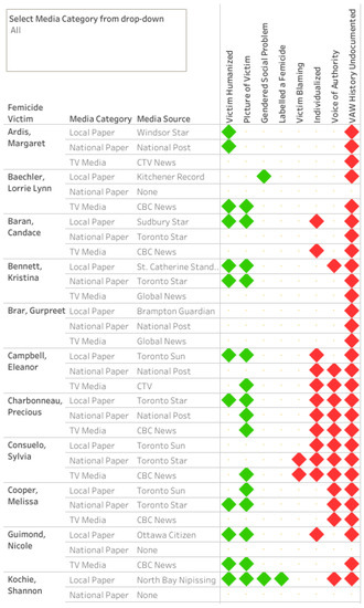 A sample screenshot from the knowledge mobilization (KMb) tool produced for the community partner. The “heat map” outlines positive and negative frames identified in different media reports for each of the 29 femicide victims in the years 2015–2016. A green or red diamond represents evidence of positive or negative framing respectively in that particular news report. On the full interactive version, available on the community partner’s website [See: https://www.oaith.ca/oaith-work/current-initiatives.html], users can select between local, national and TV media sources from the drop down menu found in the top left corner of the map. Additionally, clicking on the red or green diamond takes the user to the original media reports analyzed for this research product.