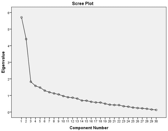 Following Little’s Missing Completely at Random (MCAR) test to test for random missing values the study used Expected Maximization (EM) to replace these. Without reverse transformation of variable outcomes reliability analysis achieved an Alpha score of 0.796 (n = 39). Subsequent removal of nine questions, which overlapped questions in content and focused on government and politics (Q21, 22, 25, 31, 32, 34, 36, 37, 39) significantly raised Cronbach’s Alpha to 0.819 (n = 30). The reason for this requires future investigation. Exploratory Factor Analysis (EFA) was conducted on this subset of survey variables (n = 30), which produced the best Cronbach’s Alpha reliability (Figure 1 Scree Plot below). This produced nine factors explaining 65% of variance, with the first two factors dividing between strong and weak positions, and collecting questions oriented to these two positions.