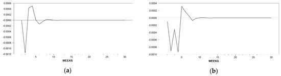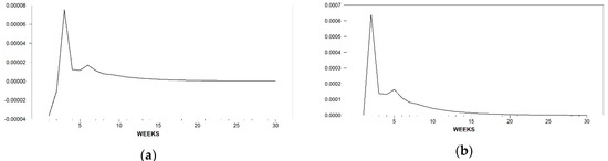 In Figure 2, for the quality cheese, the RPI response is immediate negative and small in magnitude for the first two weeks where it reverts to positive and shows a detrending pattern that collapses to the equilibrium around week 16. The FPI reaction plotted in (b) is immediate too but slightly higher and positive at each time responsive period, which benefits the farmer for the responsive period by squeezing the margin. The value reaches the equilibrium with some delay, that is, by week 19.