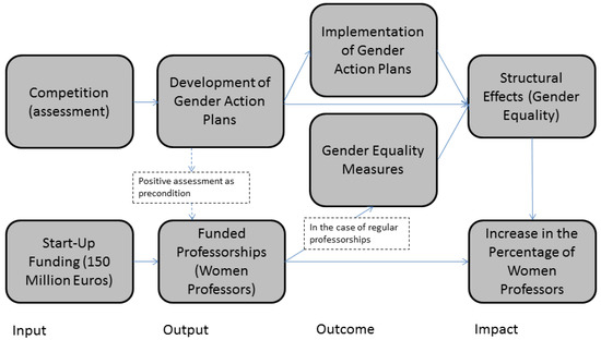 Rossi et al. (2004, p. 64) define program theory as “the set of assumptions about the manner in which a program relates to the social benefits it is expected to produce and the strategy and tactics the program has adopted to achieve its goals and objectives”. The program theory for the Women Professors Program (see Figure 1) shows that the program aims to produce structural changes and to improve gender equality at HEIs by providing start-up funding for professorships filled by newly recruited women. Funding is subject to the positive assessment of a gender action plan.2 If an external evaluation committee assesses the gender action plan positively, the HEIs have the right to apply for start-up funding (for five years) for up to three tenured professorships filled by newly recruited women. The funding can be used for regular professorships, or for so-called “early appointments to a professorship” (Vorgriffsprofessuren), that is, appointments to professorships that have been created in addition to currently occupied chairs that are due to become vacant in the foreseeable future on the retirement of the incumbent. In the case of the funding for a regular professorship, the funds already allocated for this position in the HEI’s budget—which are freed up by the program funding—must be spent on gender equality measures.