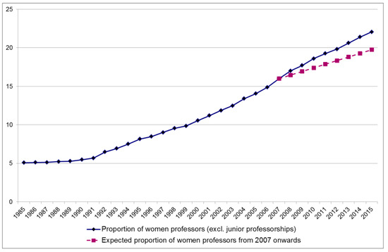 Proportion of Women Professors (Excl. Junior Professorships) 1985–2015; Expected Proportion of Women Professors from 2007 Onwards.