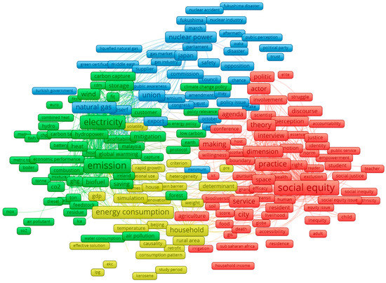 First, a network of the top 1437 most relevant terms in energy policy and social equity titles and abstracts was produced, drawing from 86,210 total terms from 5529 total papers. Nodes in this network are terms that appear most frequently together in titles and abstracts. Terms that appear more often together are clustered together by color, while the size of nodes reflects the number of times a term occurs. This network, displayed in Figure 2, highlights clusters of research around four themes. Terms such as social equity, city, resident, practice, and justice frequently co-occur together (in red), while a more technically focused part of the literature (in green) focuses on electricity, emissions, mitigation, and fuel sources. Finally, in between these clusters exist pockets of energy consumption research (yellow) and literature in response to nuclear crises and disasters (blue). With this thematic frame in mind, the schools of thought around energy policy and social equity were examined.