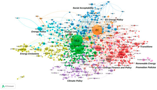 This network reveals that despite the clear silos of research demonstrated by the bibliographic coupling analysis, authors from across the network have their work cited together with the work of certain key leaders in the field, such as Sovacool and Geels or Walker and Kemp. However, several clusters remain more the domain of technical literature focusing on energy transitions. For example, Dincer leads as a top scholar in the light blue cluster, focusing on transitions to alternative energy sources such as hydrogen, while Cherp focuses on energy transitions in the orange cluster. This suggests that a few authors that are well known are seeing their work read outside their cluster, while the majority are not and are seeing their work left more isolated. This is particularly the case for the energy justice and energy transitions clusters, which, as in the bibliographic coupling analysis, are quite distant and distinct from all other clusters. Finally, several national and international governing bodies are also highly co-cited in the literature on social equity in energy policy. For example, the European Commission is highly cited in the orange cluster, while the International Energy Agency (IEA), World Bank, and US Energy Information Agency are top co-cited sources in the green cluster. In summary, this visualization describes that a few key authors hold the field together, but these key authors are the exception to the rule.