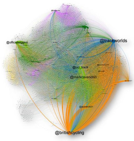The clusters reflect the grouping of the users who are talking about the event linked by close interactions. One reason for this clustering has been the language. For example, followers of Colombian cyclists are included in the same cluster and speak in the same language (Spanish). Peripheral positions influence neighbouring clusters while central positions reflect a reach to a greater number of users. Therefore, there may be a node with a high indegree but linked to a few clusters. For example, @trackworlds and @bristishcycling receive edges of few colours compared to @markcavendish or @uci_track, since these are in a central position in the graph. This is exactly the outcome provided by the use of the Fruchterman–Reingold algorithm. We can conclude that we have synthesized the conversation graphically to identify the relative position of the users in the global interaction.