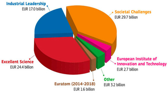 Horizon 2020 allocated approximately €80 billion to the EU’s science and technology research and innovation R & D investment fund from 2014 to 2020 and €24.5 billion for “excellent science,” “industrial leadership,” and “social challenges.” Approximately €17.9 billion from €31.7 billion were allocated for the budget. In addition, the European Institute of Innovation and Technology, Non-nuclear Direct for the Joint Research Centre (JRC), and Atomic Energy Research were respectively budgeted €1.39 billion, €1.96 billion, and €1.66 billion (European Commission 2007; Salmelin 2013).