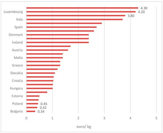 An important indicator of the CE is the “resource productivity” (Blomsma and Brennan 2017). This is defined as the ratio of a country’s GDP to the domestic consumption of materials, and shows us the economy’s efficiency in the 27 EU member states to use materials to produce well-being (Haas et al. 2015). Figure 1 shows the value of this indicator, calculated in euro/kg, at the level of EU member states.