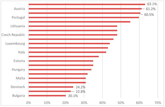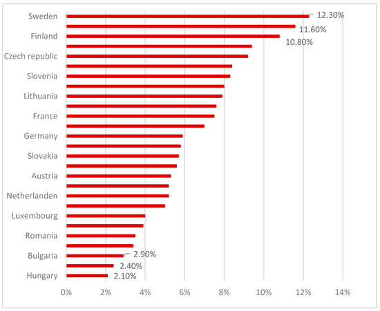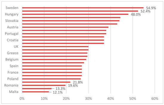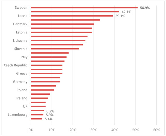 From this graph we could conclude that Nordic EU states were the countries with the highest green energy use, namely, Sweden (50.9%), Finland (42.1%), and Latvia (39.1%). On the opposite side were the following countries: the Netherlands (6.2%), Luxembourg (5.9%), and Malta (5.4%).