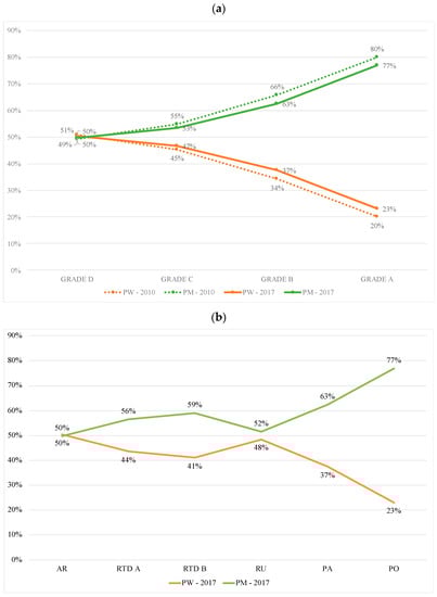 The analysis of 2010 and 2017 data provides the well-known “scissors diagram” of gendered patterns of career progression reported in Figure 1a. Even though this diagram presents striking evidence of vertical segregation in the Italian academy, it seems to show a slow reduction of gendered scissors and the achievement of an equality condition at the first stage of academic careers, with 51% of women and 49% of men holding research appointments in 2017 (50% and 50% in 2010) and with only three percentage points that remove academic recruitment positions (grade C) from gender equality (five points in 2010).