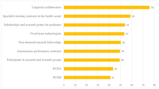 The precarious body in academia is composed of different components: alongside fixed-term researchers and research fellows, there are collaborators in research activities, linguistic collaborators, and contract professors. These latter categories, although they constitute a large component of academic precariousness, cannot be considered as a pre-university body in the strict sense, since they include external professionals who carry out teaching activities at the university and professionals who are not oriented towards an academic career4. Therefore, except when not explicitly declared, with the expression “fixed-term positions” in this article we refer to the positions of fixed-term researchers and research fellows and not to all figures in pre-academic roles.