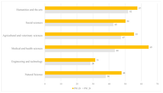 Figure 3 compares the values of the proportion of women in fixed-term positions and in the academic entry position in the different FORDs, while Figure 4 compares the values of the proportion of women in permanent academic positions and in top-level academic positions in the different FORDs. Table 10 also shows the values of the GDI and the in the different FORDs.
