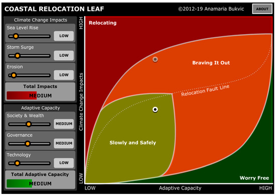 The visual representation resembles that of a leaf and includes a main pointer indicating a “where we are now” state determined by the integration of CCI and AC attributes. A second semi-transparent point is placed above the main marker, specifying a possible placement in the event of a surprise event or major disaster, and measures up to a 100% increase over the baseline value, a jump with a range dependent on community adaptive capacity. Each horizontal slider moves independently from low to high for each variable. Individual CCI variables affect the cumulative CCI value differently. For example, even a single impact, such as SLR increase, is capable of eliciting the highest total CCI considering that absolute inundation would not leave any possibility of in situ adaptation and inhabitation. The values of the AC sliders are equally averaged to reflect the mutual co-dependence of all factors. Similar to CCI variables, AC variables tend to be correlated, considering that higher socioeconomic status generally also suggests a higher degree of functional governance and technological advances. Since the relationships between CCI and AC variables vary based on scale, location, and context (e.g., even within single local institutions, it is possible that individual departments are not equally effective and cohesive), all sliders move independently to allow for the customization of diverse circumstances in coastal communities. For the optimal adaptive capacity, all settings need to be in the rightmost position.