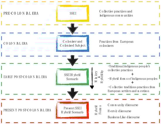 We claim that, as Figure 1 depicts, Colombia represents a hotchpotch that combines indigenous traditional and colonial approaches where historical processes (the pre-Columbian, colonial, and postcolonial periods) as well as socio-economic and political contexts have clearly influenced the development of the SSEI sector. The expansion of meanings attached to the SSEI sector in Colombia is a reflection of the dynamic interplay of the hybrids, as it incorporates the hero entrepreneur and business-like discourses within the traditional community discourse, which indeed is a combination of domestic (indigenous practices) and colonizer influences (e.g., cooperatives and association). This clearly explains how the integration (or mingling) of different practices from the colonizer (global North) and the colonized cultures (global South) have created a unique ‘hybrid’ SSEI model in the country (Bhabha 1994).